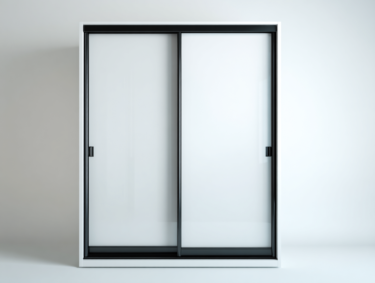 Dieser Kleiderschrank mit Schiebetüren präsentiert eine klare minimalistische Gestaltung mit dunklem Rahmen und hellen Glasflächen. Die Kombination aus schlanker Linienführung und neutralen Farben passt gut zu modernen Schlafzimmern oder Ankleidezimmern. Durch die Schiebetürtechnik bleibt der Bereich vor dem Schrank frei nutzbar, wodurch das Möbel besonders praktisch für kompakte Wohnräume ist.